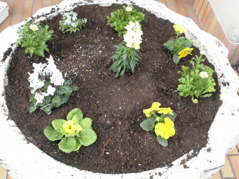 花の種類や色の組み合わせを考えながら、みんなで協力して手際よく花を植えていました。