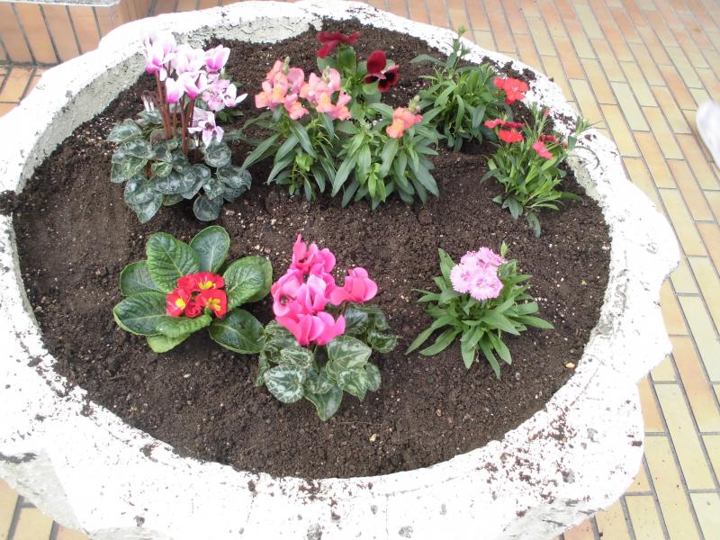 シクラメンや金魚草など、いろいろな種類の花のおかげで、児童玄関前がとても明るくなりました。