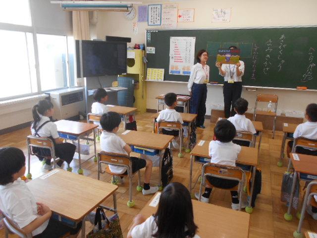 校長先生は、「常日頃から放送をしっかり聞くこと」「いかのおすし」について話をしました。