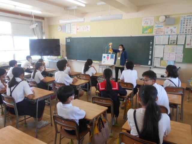 養護教諭の越能先生が、熱中症対策について、全校の子供たちにお話をしました。