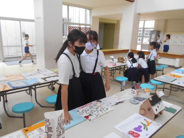 本校プレイルームには、子供たちが夏休み中に取り組んだ「科学研究・調べる学習コンクール・工作等」を展示してあります。子供たちは、休み時間にいろいろな作品を見ながら、「へーっ、そういうことなんだ」「これ、詳しいよ!」「おもしろい!」などと感想を述べています。友達や異学年の仲間の作品から、アイディアのよさや内容を学んでいる姿、作品の良さを認め合っている姿が見られています。