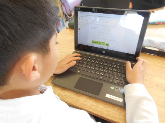 児童は、これまでに学習経験のあるピラミッドチャートを用いて、グループで考えを出し合う活動に取り組みました。