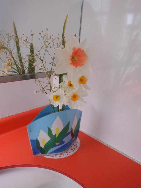 定期的に来校され、お花を生けてくださっています。花瓶に掛けた手作りのカバーには、風物詩が描かれ、お花のかわいらしさを一層引き立てています。階段の上り下りやトイレを使用する際に、お花を愛でることができ、心がほっこりします。中西さん、いつもありがとうございます。