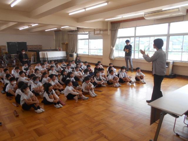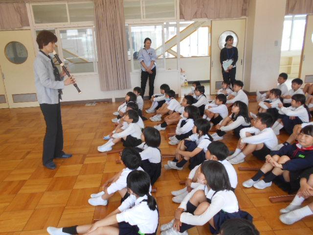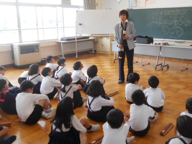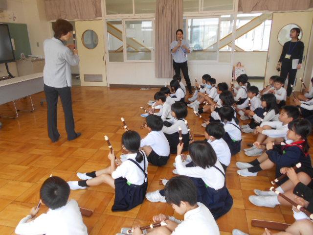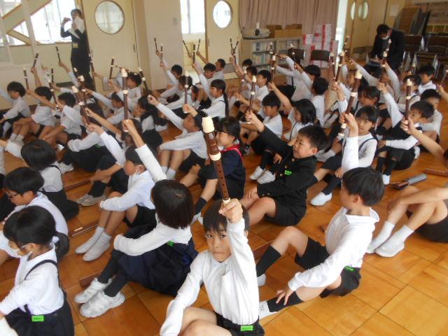 外部講師の方に、リコーダーを吹くときに大切な息遣いや指遣い、タンギングについて分かりやすく教えていただきました。講師の方がソプラノリコーダー以外にも、大きなリコーダーや小さなリコーダーで演奏をして下さり、子供たちは目を輝かせながら聞き入っていました。