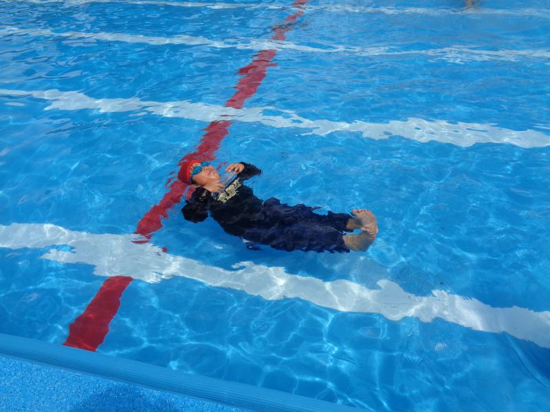 水着だけで水に入る時とは違い,「重たい!」「動きにくい!泳ぎにくい!」など服が水に濡れた時の重さを実感しました。万が一溺れた場合,助けを待つ間,むやみに泳がずに「浮いて呼吸を確保する」ことをポイントとして,ペットボトル等を用いて活動をしました。