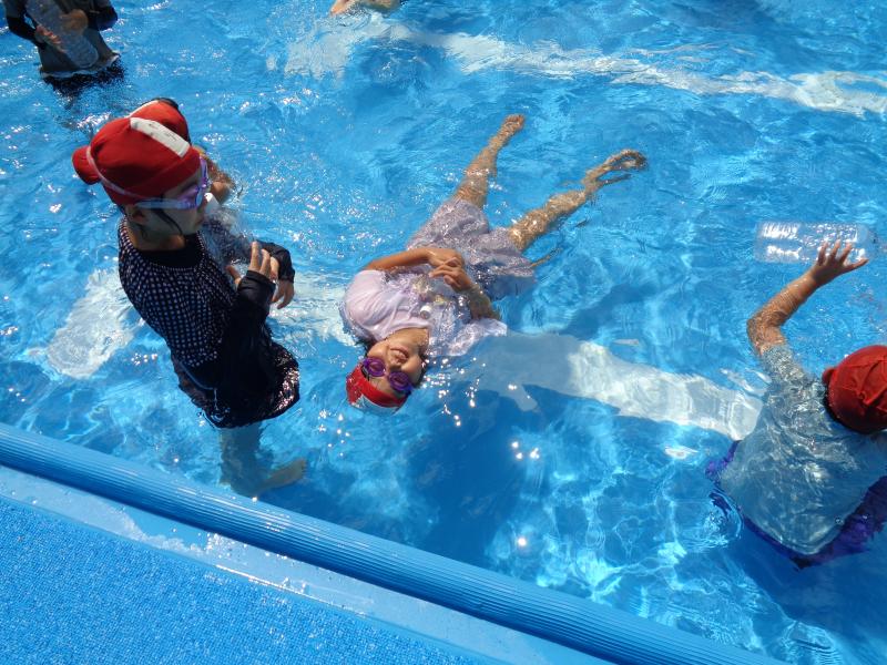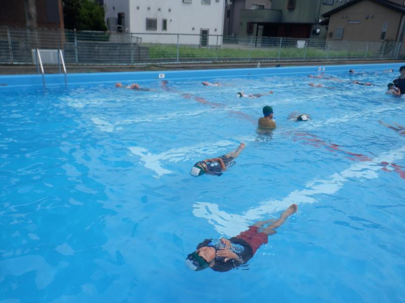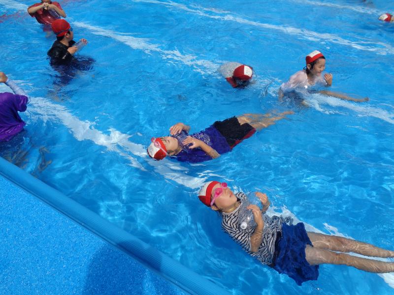 水着だけで水に入る時とは違い,「重たい!」「動きにくい!泳ぎにくい!」など服が水に濡れた時の重さを実感しました。万が一溺れた場合,助けを待つ間,むやみに泳がずに「浮いて呼吸を確保する」ことをポイントとして,ペットボトル等を用いて活動をしました。