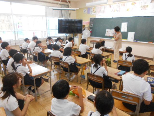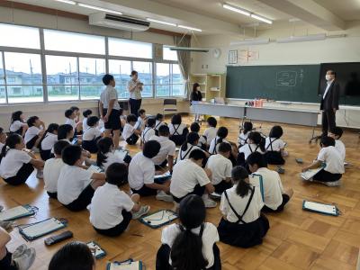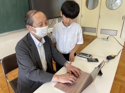 総合「誰もが住みやすい町づくり」の学習で、子どもたちは目の不自由な方がどのように生活しているかについて調べるために、石川県視覚障害者協会の米島さんにお話を聞くことにしました。