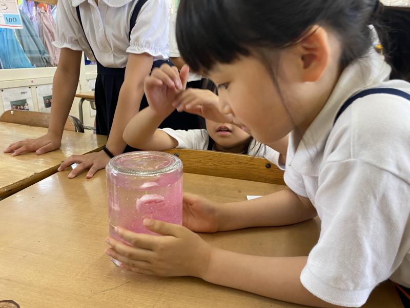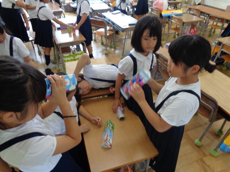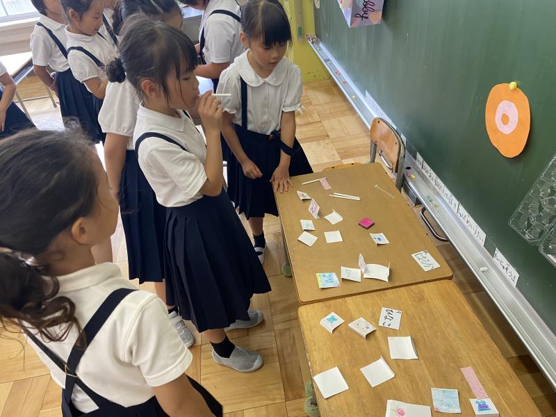 2年生は生活科の単元「せかいで一つわたしのおもちゃ」で身近にあるものを使って動くおもちゃを作り、お祭りの縁日のおもちゃ屋さんのようにして各クラスのおもちゃを楽しみました。ゴム鉄砲や吹き矢などゴムや風、空気の力を利用したおもちゃや的当てゲーム、万華鏡、スノードーム、ブローチなどのおもちゃがあり、みんなで楽しく活動できました。