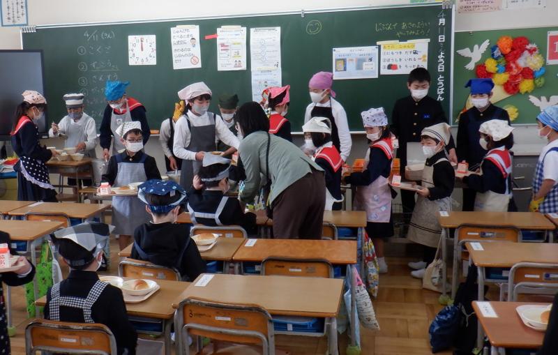 4月11日から1年生の給食も始まり、慣れるまでのしばらくの間、6年生が1年生の給食の準備を手伝ってくれています。6年生は、丁寧に盛り付け、優しく1年生に手渡してくれます。