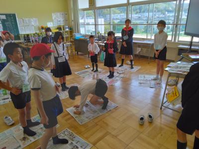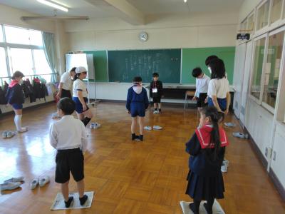 始めに動画を見て安全な歩き方や交通ルールを学びました。その後,体育館で道路に見立てたコースを,交通ルールを守って安全に歩いてみました。しっかりと「右を見て左を見て,もう一度右を見て」渡っていました。