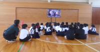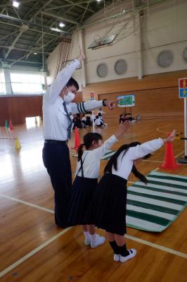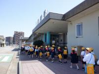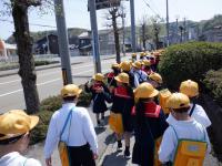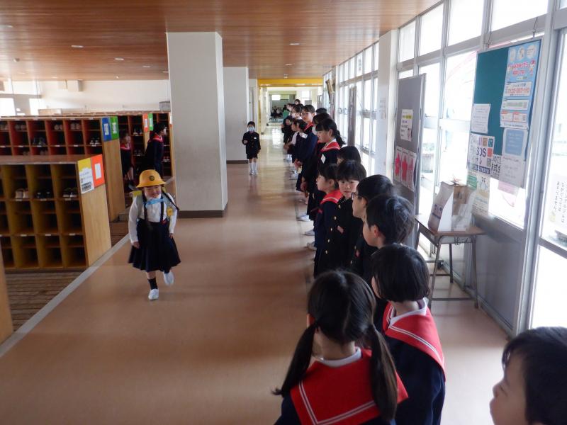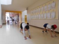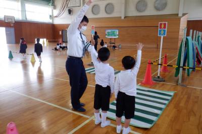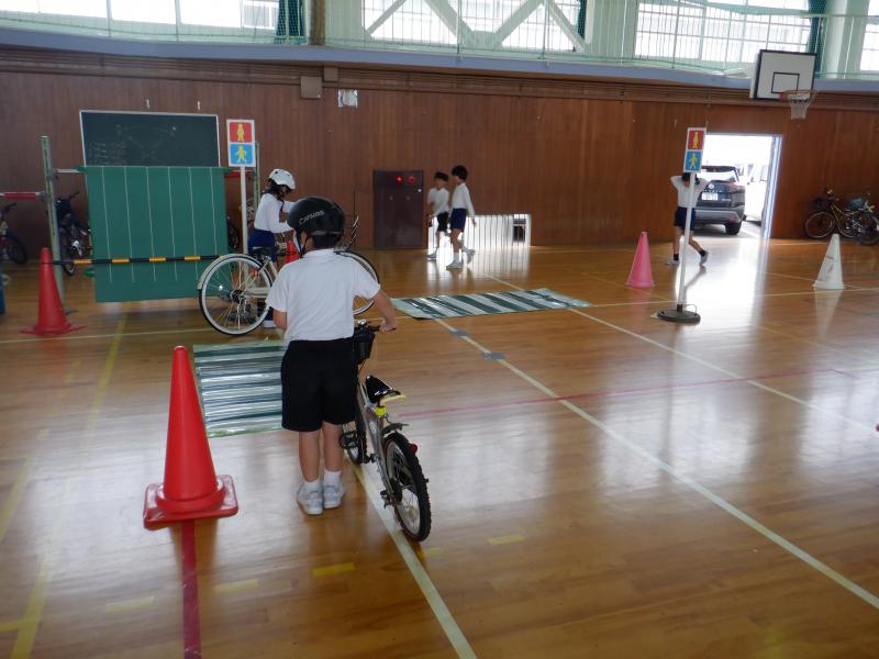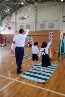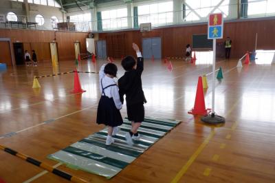 始めに動画を見て安全な歩き方や交通ルールを学びました。その後,体育館で道路に見立てたコースを,交通ルールを守って安全に歩いてみました。しっかりと「右を見て左を見て,もう一度右を見て」渡っていました。
