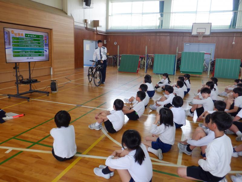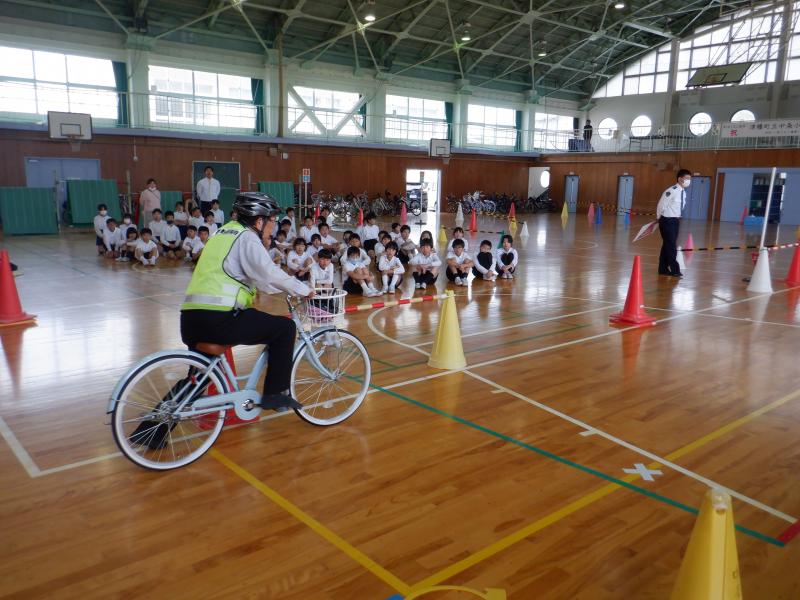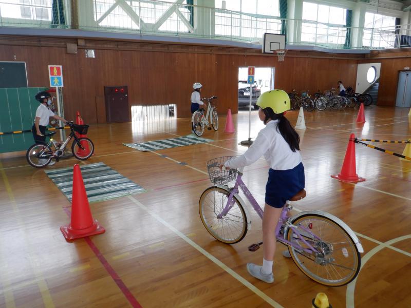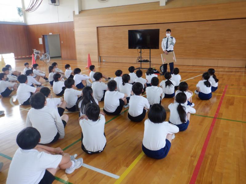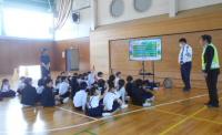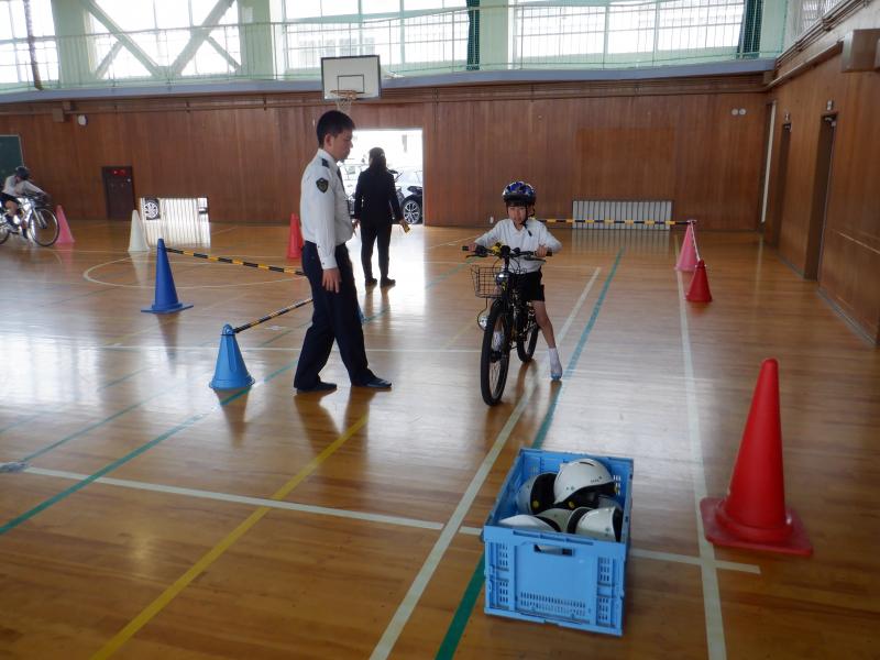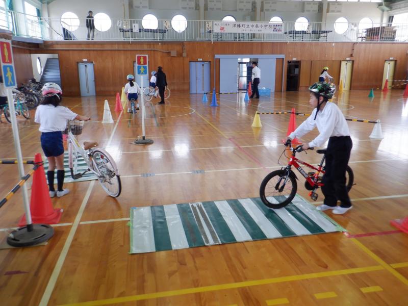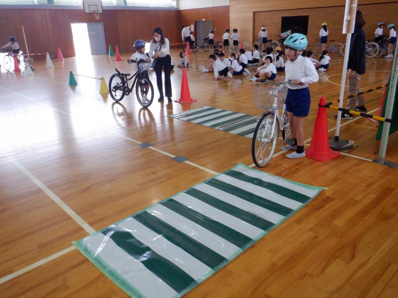 津幡警察署の方からは,「止まれ」の標識で一旦止まることや,左右・後方を確認すること,横断歩道は降りて渡ることなど安全な自転車の乗り方と自転車に乗るときの交通マナーについて教えていただきました。子供たちは,警察署の方から教えていただいたことを守り,安全に自転車に乗ることができていました。