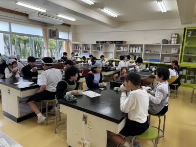 家庭科室の使い方も初めてのことばかりですが、先生の話を聞き、班のみんなで協力して、