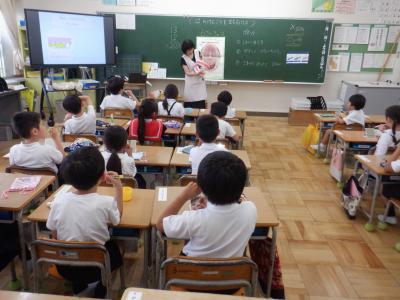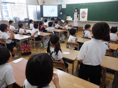 養護教諭の先生と一緒に、1年生が歯の健康について学びました。