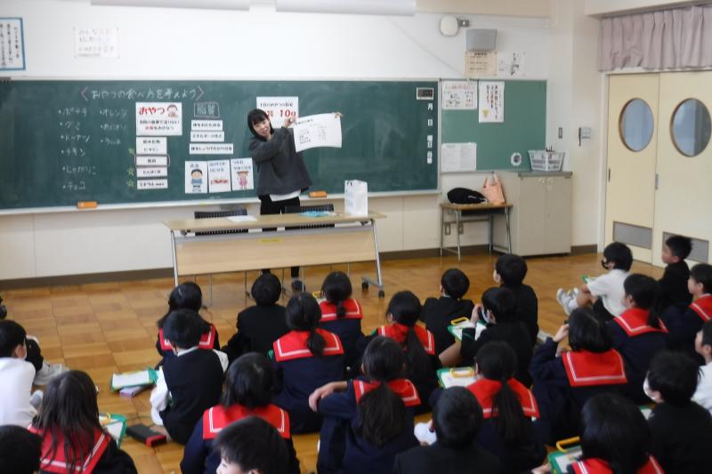 4年生は,おやつをとる目的は,「3回の食事で足りない栄養素を補うこと」と知り,栄養素の中の「脂質」に注目し,普段食べているお菓子の成分を調べました。子供たちは,「このお菓子を全部食べてしまうと,1日の脂質の摂取量を超えてしまう。」「おやつには,みかんやバナナ,牛乳,チーズなどがよいから明日から取ろう。」など普段食べているおやつの取り方を見直す機会となりました。