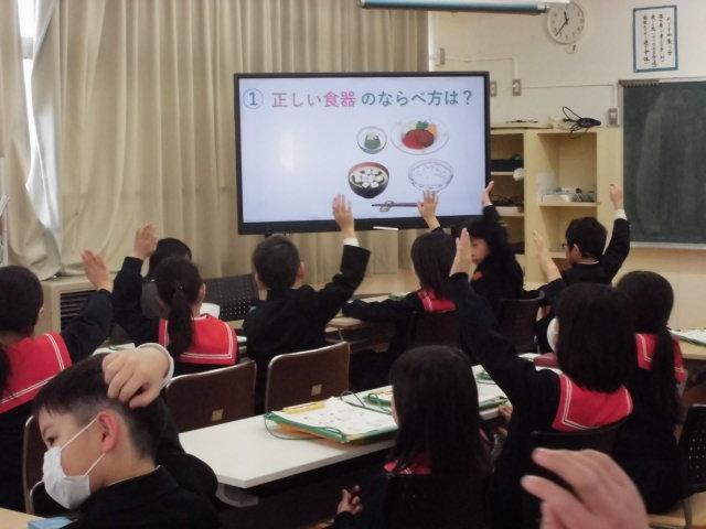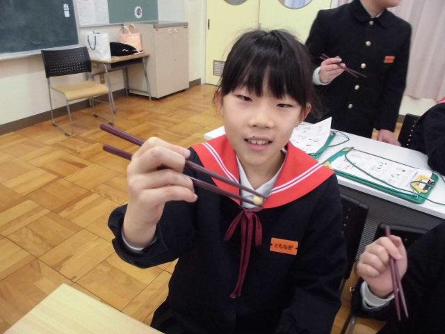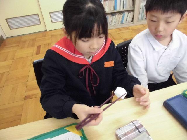 3年生は,食事のマナーについて学習しました。食事中の姿勢に気を付けることや,「いただきます。」や「ごちそうさま。」のあいさつで,感謝の気持ちを表すことを教えていただき,日頃の食生活について見直しました。また,箸の正しい使い方を知るために,豆つかみにも挑戦しました。