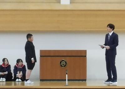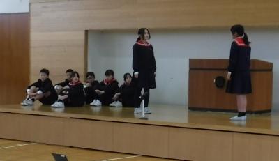 1月20日に、英語スピーチコンテストに出る11人の5・6年生が全校のみんなの前でスピーチを披露しました。