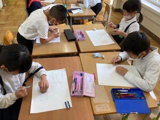 11月15日(火)1年1組の子ども達が、算数の時間に積み木を使って形の学習をしていました。積み木の側面の四角や三角・丸などの形を上手に写して、自分の思い描いたイメージの絵になるようにと、一生懸命に取り組んでいました。