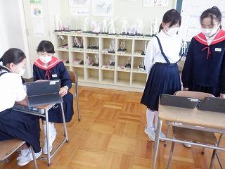 11月17日(木)5年2組の子ども達が、クロームブックの地図を使って、自宅までの道のりを伝える学習をしていました。子ども達は、学んだセンテンスを上手に使って説明できるようにと、ペアになって練習したり画面を見ながら練習したりしていました。