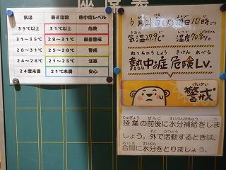 暑い日が続き、各地で熱中症での事故が起きています。本校では、熱中症対策として、養護教諭と保健委員会が毎日熱中症レベルを知らせてくれています。また、休み時間には、帽子を着用し、水筒持参で遊んでいます。みんなで安全に遊べるよう、熱中症対策を続けていきましょうね。