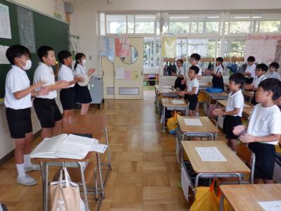 12日(火)、赤組、白組それぞれの応援団が、1~3年生の教室に応援の内容を伝えに行きました。