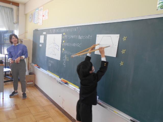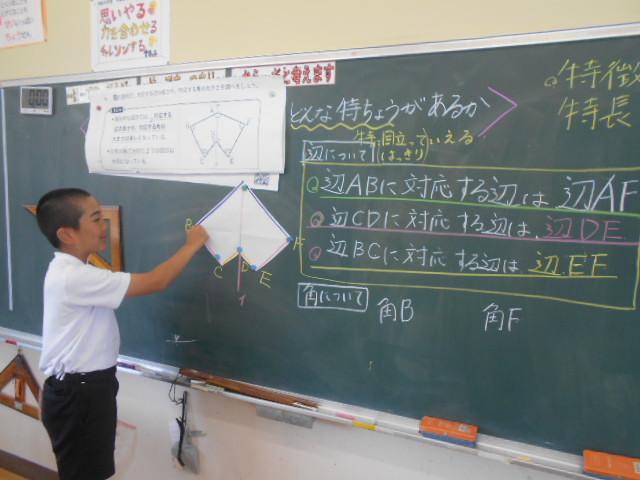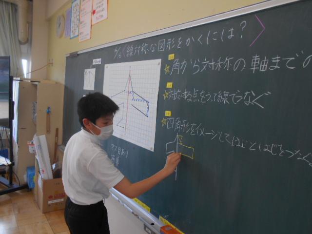 自分の考えを、相手に伝わるように、黒板に出てかきながら説明する姿。