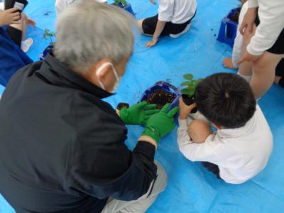 自分で選んだ苗を、優しくポットから取り出し、鉢の中へ植えることができました。大きく元気に育つようこれからお世話を頑張ります。