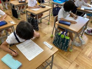 本校では、子ども達の困り感を把握するために、毎月1回全校一斉に「中条っ子アンケート」を実施しています。今月の実施日6月13日(月)には、平仮名が読めるようになった1年生も、初めて自分でアンケートに書きながら取り組んでいました。