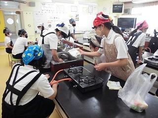 6月1日(水)6年1組の子ども達が、野菜炒めとスクランブルエッグの調理実習をしていました。学習で学んだ材料に応じた洗い方や適した切り方・味の付け方・盛りつけなど、グループで協力して、確かめながら作っていました。