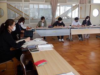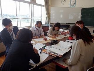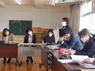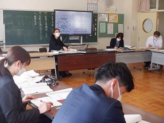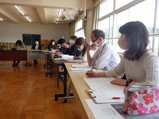 5月16日(月)3年2組の研究授業の後、「楽しく学び合う授業」をめざし、全教員で全体研修会を行いました。研究の重点に沿ってグループで協議したり、指導主事の講評を聞いたりして、自分の授業改善に向けて学び合いました。