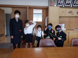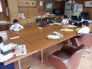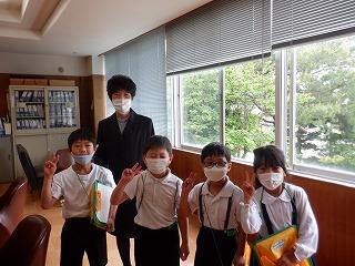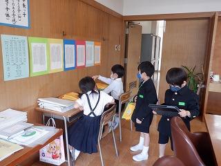 5月16日(月)1年生が、学校探検をしました。この日のテーマ「きになるばしょにいってみよう!」のもと、2つのグループが校長室に探検に来てくれました。写真係の子が代表でクロームブックを使って写真を撮ったり、見つけたものを探検カードに書いたりしながら、楽しく探検していきました。