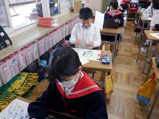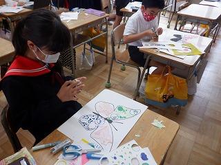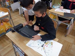 5月17日(火)4年1組の図工の時間、子ども達が丁寧に作品づくりをしていました。この日は、自分のイメージで作成した「まぼろしの蝶」を引き立てる背景模様を、クロームブックで調べながら取り組んでいました。どの子も楽しみながら取り組んで、個性豊かに描いていました。