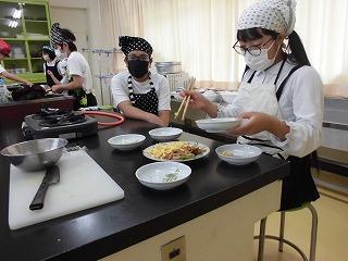 6月1日(水)6年1組の子ども達が、野菜炒めとスクランブルエッグの調理実習をしていました。学習で学んだ材料に応じた洗い方や適した切り方・味の付け方・盛りつけなど、グループで協力して、確かめながら作っていました。