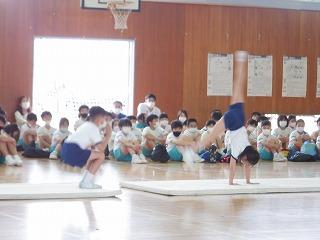 6月1日(水)町器械運動交歓会が、本校体育館で行われました。レベルを上げた技ができるようにと高みをめざして毎日練習してきた4年生。本番では、練習の成果を発揮し、どの子も堂々とした声と演技で発表していました。一緒に頑張ってきた友達と気持ちをそろえて演技し、全員で集中してやり切る姿が、とっても素敵でした。