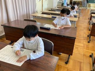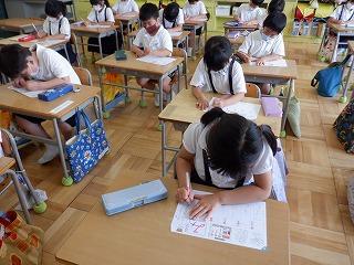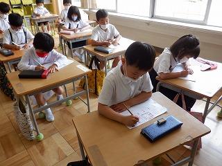 6月1日(水)1年2組の子ども達が、ひらがな練習をしていました。この日の練習は「み」の字。おれ・まがり・とめ・はらいの4つのポイントに気を付けながら、どの子も丁寧な文字で書いていました。