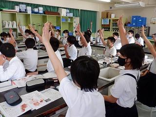 6月1日(水)6年2組の理科の時間、子ども達は、人体模型を基に、食べ物が口・胃・腸などを通る間に消化・吸収・排出されることを学んでいました。模型を使って説明する友達の意見を聞きながら、「人の体のつくり」について理解を深めていました。
