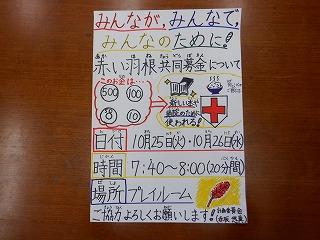 明日10月25日から2日間、計画委員会が赤い羽根共同募金に取り組むため、全校児童に協力を呼び掛けるポスターを作成し、玄関や廊下に掲示しました。