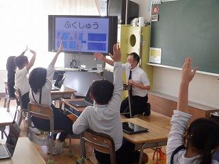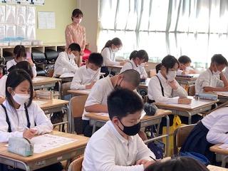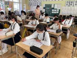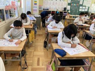 10月13日(木)5年2組で、英語の聴き取りテストをしていました。中・高・大学でもリスニングやヒアリングを重視しているので、小学校の間から英語を聞く力を付けていくことは大事ですね。子ども達は、CDの音声を聴きながら、真剣な表情で問題に取り組んでいました。