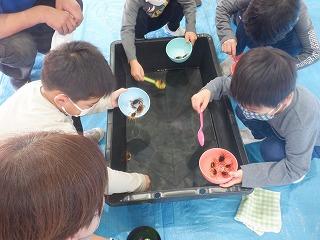 コロナ感染防止対策のため、前半と後半に分かれての体験でしたが、さわがにすくい・海底の宝物つかみ・アカハライモリタッチなど6つのすべてのブースで、子ども達と保護者の皆様の笑顔があふれ、楽しいひと時となりました。