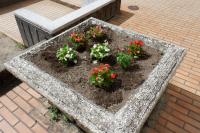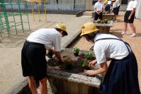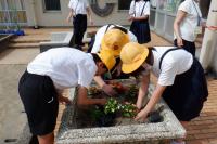 環境委員会は、児童玄関と小運動場にある花壇にベコニアと日日草の苗を植えました。