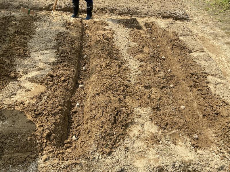つぎは、畝(うね)をつくります。畝は15cmぐらいの深さでつくっていき、そのなかに種いもを植えます。種いもとは芽の出たじゃがいもです。