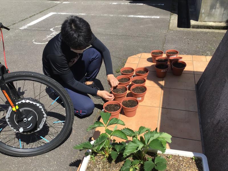 本来であれば、みなさんといっしょに植えて、成長を観察しながら、実験を行っていくのですが、臨時休業があり、みなさんと植える事ができません。そこで、先生たちで一足先に植えました。どのように植えたのか、どんな様子かをみなさんに知ってもらうために、ここで紹介します。休業が明けてどのように育っているのかも楽しみにしていてください。