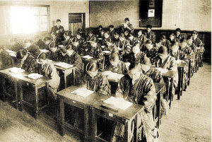 授業ではやはり裁縫が主体で、一日3時間は必ず実施された。一般学科はあまり重視されないというよりは生徒の方の熱が乏しいので、幾何など先生も生徒も苦しんだようである。西洋史や東洋史も進学志 望生には特別授業を必要とした。瓜生校長は時々課外に論語を講義されて、儒教の人倫を説いて深い感 銘を与えられ、井上先生(校医・江沼病院長)も時々性教育に名講義をなされ、古い倫理に加えて新しい時代の空気を呼吸することを忘れなかった。国語の時間は文学少女が多かったためなかなか熱心であった。