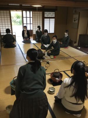学年の隔てなく仲良く活動しています。貞志庵で稽古をすることで、和室での行儀作法も身に付きますし、許状が取れることもよい目標になっています。何より、毎回の部活動でのおいしいお茶とお菓子が楽しみです。茶道の基本からしっかりと丁寧に教えていただけるので、誰でも1年間でお茶を頂く作法が身に付き、お茶を点(た)てることもできるようになります。今年度は、文化祭で茶会を開き、先生方や生徒のみなさんはもちろん、保護者の方にもお茶を楽しんでいただくことができました。