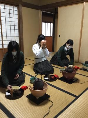週2回、薄茶の風炉点前を中心に稽古をしています。6月の高文連主催の茶会、夏の裏千家主催の「緑陰の集い」、8月の聖高祭での茶会、その他地域の高齢者施設の呈茶訪問など、お茶を通して県内の高校生や地域の方々と交流する機会がたくさんあります。お茶とともに季節のお菓子やお花を楽しみ、新年の初釜では年に1度の濃茶を味わいます。普段の稽古を通して、作法を学ぶだけでなく、伝統文化に触れ、季節の移ろいを感じ、相手を思いやる心を知るなど、多くのことが身につきます。3年間活動すれば、裏千家の許状も取得できます。