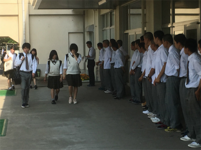 この日、33℃を越える暑い(痛い)日差しのなか、本校から陸上部、ソフトボール部の有志が約27kmを完歩し、生徒会執行部、女子バスケットボール部、放送部も途中合流して、最終区間は生徒、職員合わせて50人が華やかなパレードに加わり、大聖寺の街を練り歩きました。