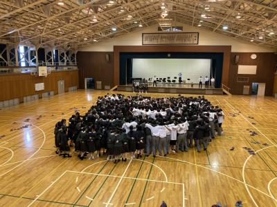 本日、総体・総文・壮行式を行いました。今年、初めての試みで全校生徒で円陣を組みました。選手の皆さん大会頑張って下さい!!
