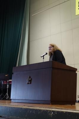 新任式では、2学期から新しく本校のALTとなるサマンサ先生が、全校生徒に日本語で挨拶されました。
