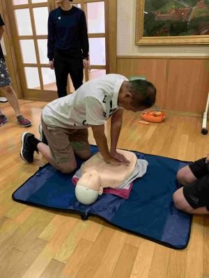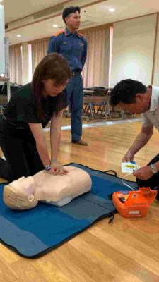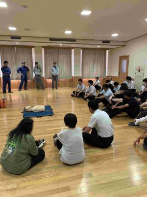 8月1日(金) 加賀市消防の大聖寺分署の皆さんにご協力いただき、AED講習会をしていただきました。いざという時に備え、胸骨圧迫とAEDの使用手順について実践的に学びました。