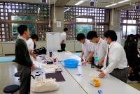 金沢工業大学で第2回KIT科学チャレンジが開催されました。本校からは来週19日に行われる「いしかわ高校科学グランプリ」に出場する2年生5人と1年生4人が、実技競技の練習を兼ねて参加しました。今日のお題は、コピー用紙12枚とセロハンテープで頑丈なクレーンを製作するというもの。まずは個人で試作したあと、チームでディスカッションしながら、1基のクレーンを製作しました。そして、どのチームのクレーンがより多くの重りを吊るせるかを競い合いました。1年生チームのクレーンがけっこう健闘していたようです。